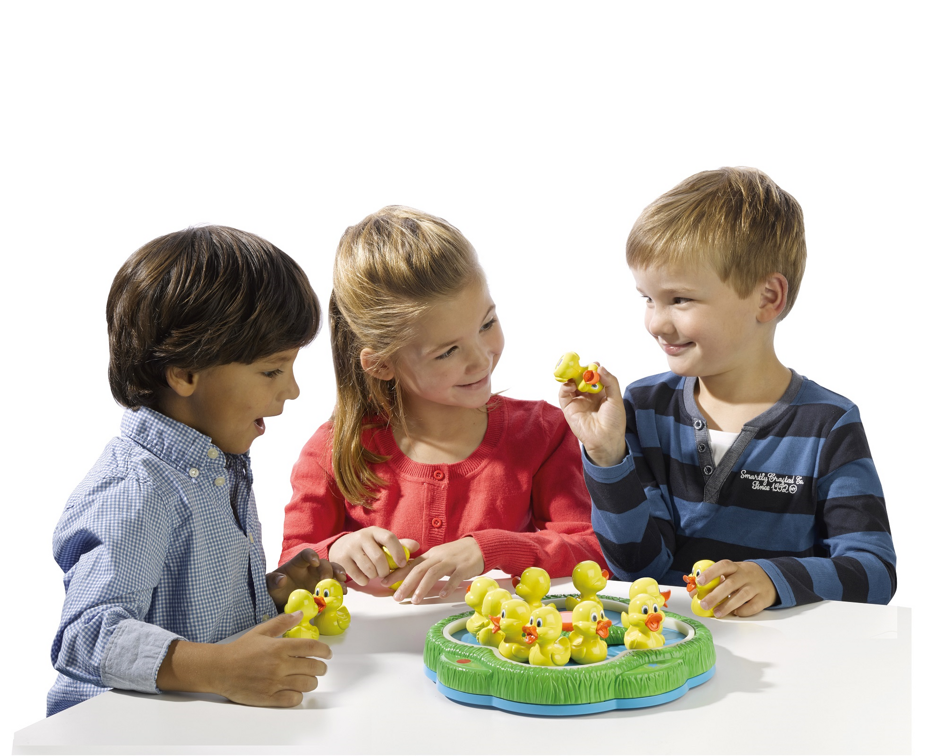 This wacky, quacky memory and matching game combines developmental skills for young children with the fun of a “My First Game,” helping kids with shape recognition and colors. Switch on the circular pond, and the ducks start swimming – the bottom side of each duck has a colored shape. Players take turns picking up a duck and looking at the color and shape; if it matches their colored shape, they get to keep the duck. If it doesn’t match, they put it back. The ducks continue to swim, so it’s more challenging than a traditional memory game but easy enough for even the youngest duck lovers to play. The first player with 3 ducks that match their shape wins! Requires 2 AA batteries (not included). For 2-4 players, ages 3 and up. Includes a fun Pop the Pig Make-A-Match Card Game!
