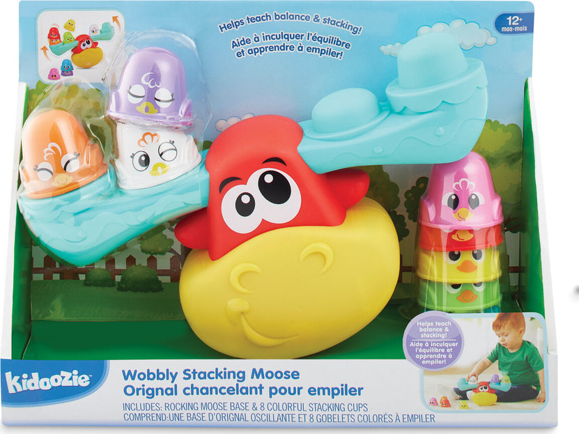 A colorful and engaging toy to help teach balance and stacking. How high can they stack the cups before he starts to wobble? Includes weighted moose base and 8 colorful stacking cups.